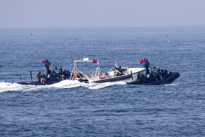 年節將屆,海軍29日執行春節加強戰備,操演初期模擬不明機漁船在周邊海域徘徊,兩棲偵搜大隊運用M109突擊艇操作SBI攔截戰術實施驅離。(中央社記者鄭清元攝)