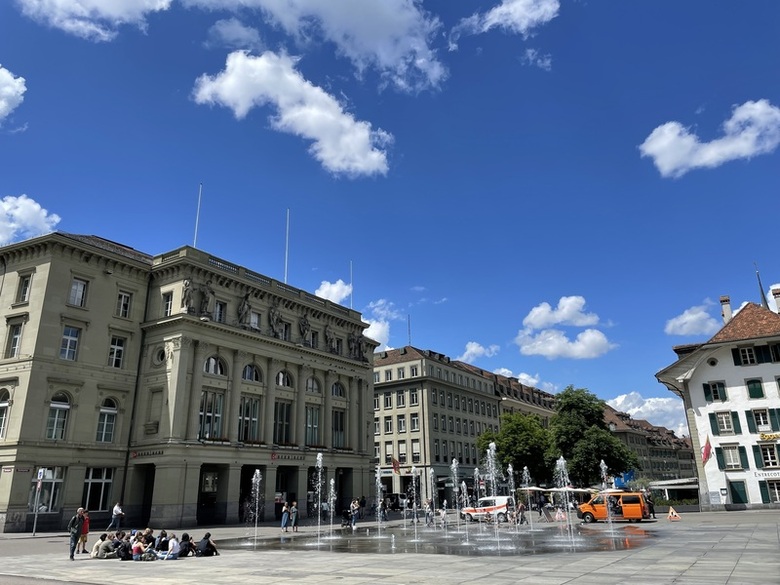 由於全球安全威脅情勢持續升高,歐洲周邊地緣政治風險加劇,瑞士聯邦議會計劃在2032年前逐步提高國防預算。圖為瑞士聯邦議會前廣場噴水池,攝於2025年5月。(中央社記者郭芳君伯恩攝)