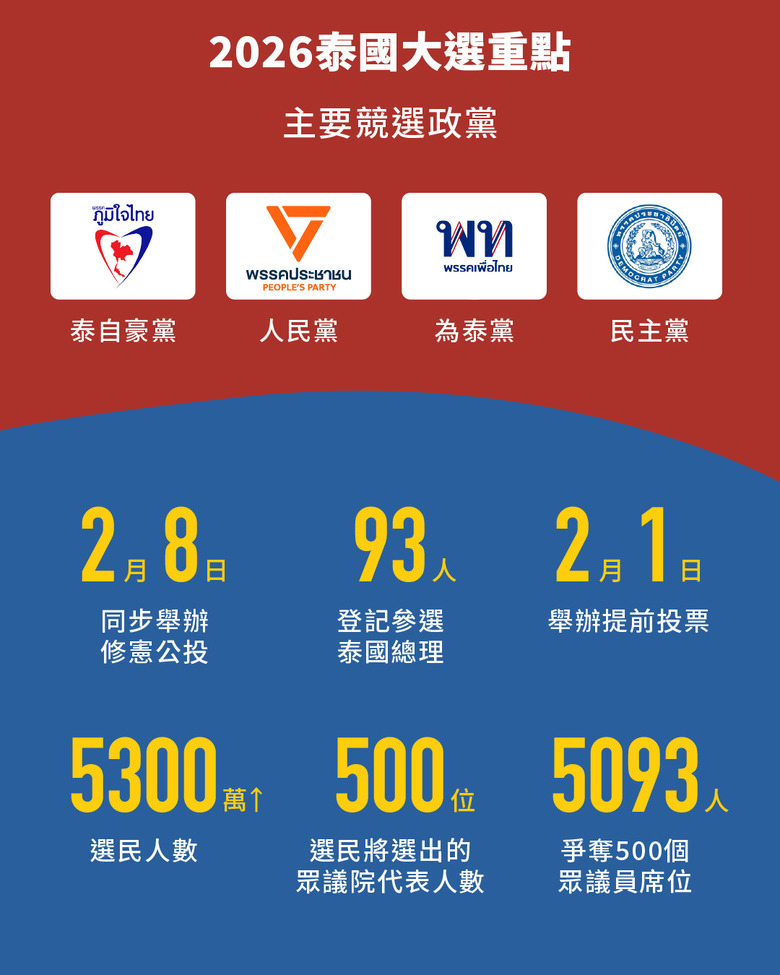 選務方面,雖然正式投票日為2月8日,泰國選委會已規劃於2月1日開放提前投票,對象包括身心障礙者、海外公民,以及需在選區內或選區外提前投票的選民。無法於投票日投票者,須在2月1日至7日,或2月9日至15日期間向相關單位回報。