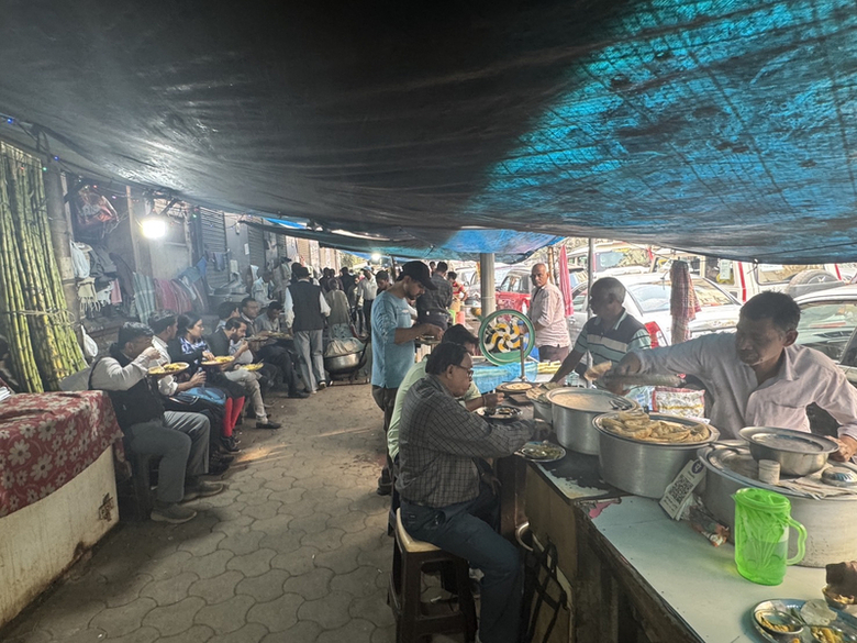 世界衛生組織(WHO)認為印度立百病毒疫情傳播屬「低風險」狀態,不必針對旅行、貿易做出限制。圖為疫情爆發地西孟加拉首府加爾各答街頭,民眾在小吃攤排排坐用餐,不見緊張氣氛。(民眾提供,中央社記者李晉緯新德里傳真)