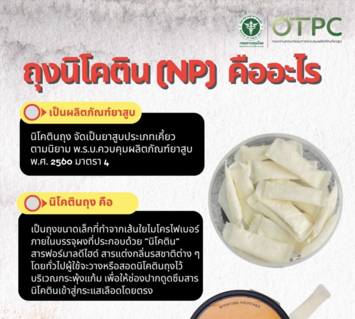 菸草產品管制委員會辦公室主任差雅南(Chayanan Sitthibut)補充指出,尼古丁袋屬於依法嚴格管制的菸草產品,販售時必須完全遮蔽,不得陳列展示,其管理方式與紙菸及手捲菸草相同。即便產品合法課稅,若違反《菸草產品管制法》規定,仍可能面臨法律責任。