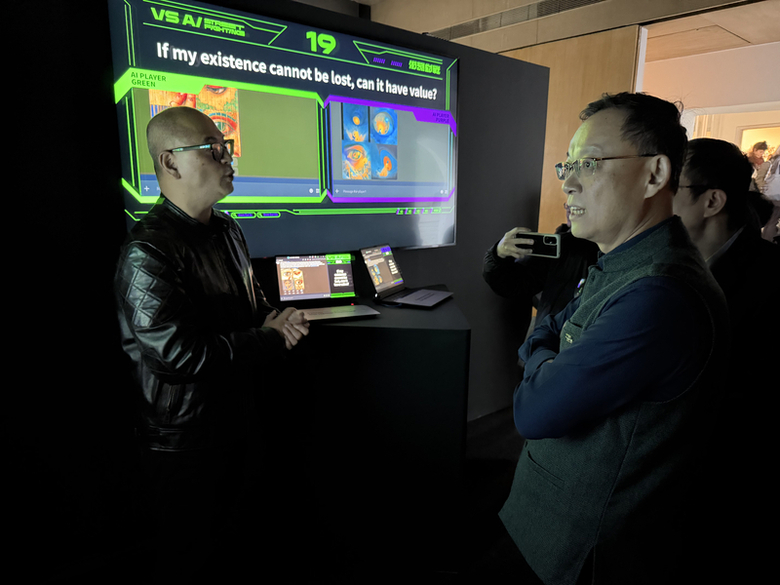 印度KHOJ國際藝術家協會主辦的科技藝術展暨國際研討會,於30日開幕。台灣有兩組團隊獲邀參展,期望透過作品讓人反思在AI世代的處境與因應之道。圖為台灣團隊「超維度」作品「VS AI 街頭對戰」。(中央社記者李晉緯新德里攝)