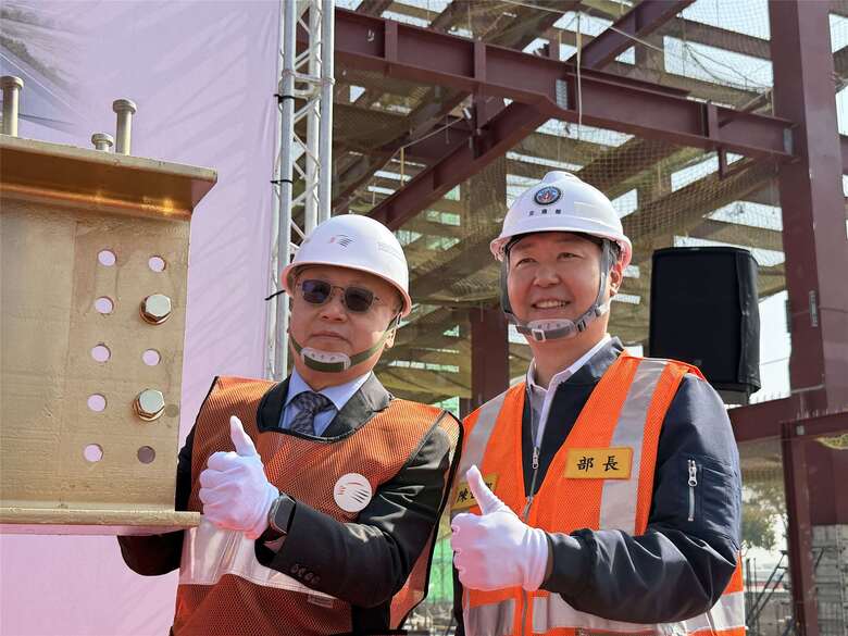 交通部長陳世凱(右)日前和台灣高鐵董座史哲(左)為高鐵左營基地「第二檢修廠」舉行上梁典禮時,期許高鐵新世代列車N700ST能在2027年8月上線服務。(央廣吳琍君攝)