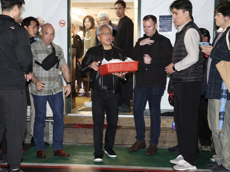 輝達(NVIDIA)執行長黃仁勳(前中)1日傍晚在台北鄒記食舖與台積電董事長暨總裁魏哲家等高層餐敘,兩度到門口發送紅豆餅給媒體與民眾。(中央社記者張新偉攝)