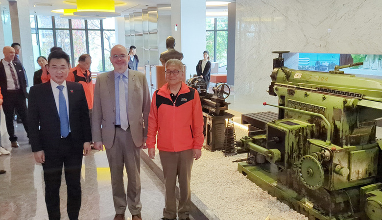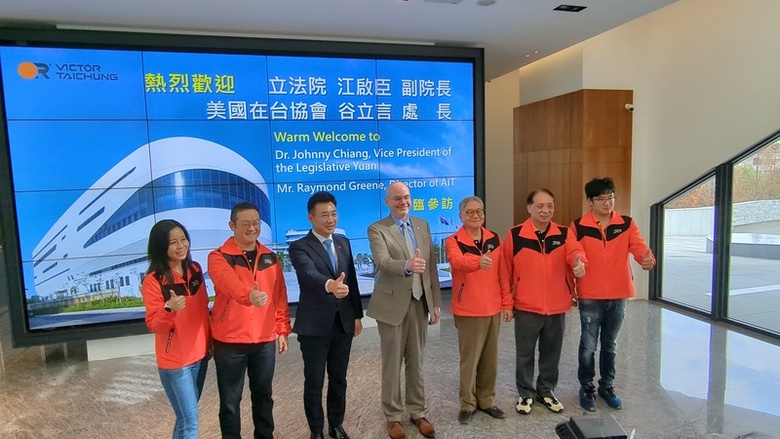 谷立言(Raymond Greene)6日在立法院副院長江啟臣陪同下,上午前往位於台中市南屯區的台中精機公司參訪產線,接著出席江啟臣與台灣智慧自動化與機器人協會舉辦的座談會,共同與工研院、中部3大公會(機械、工具機、木工機械)理事長及代表交流。