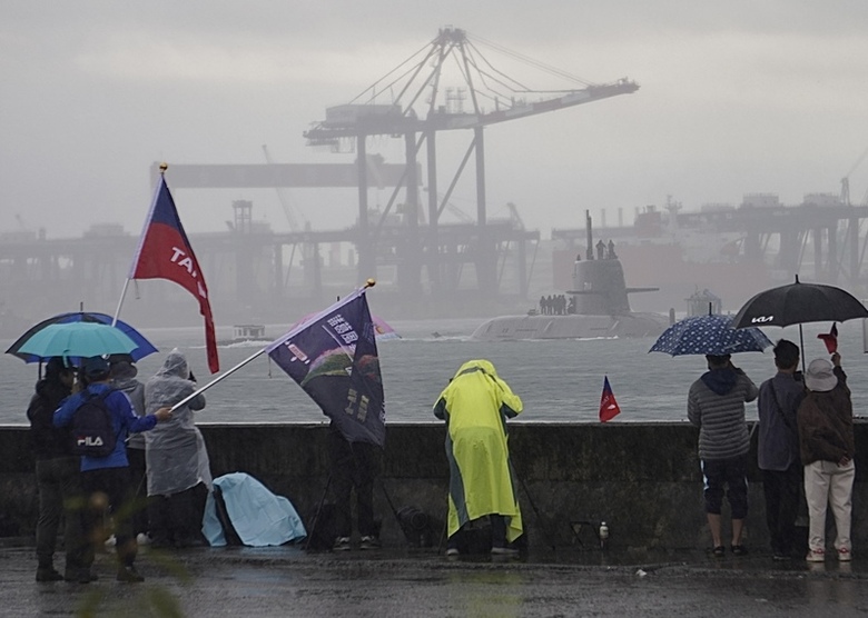潛艦國造原型艦海鯤艦連續2天進行潛航測試,6日高雄下起陣雨,但仍有軍事迷穿著雨衣、撐雨傘在港邊等候。(中央社記者董俊志攝)