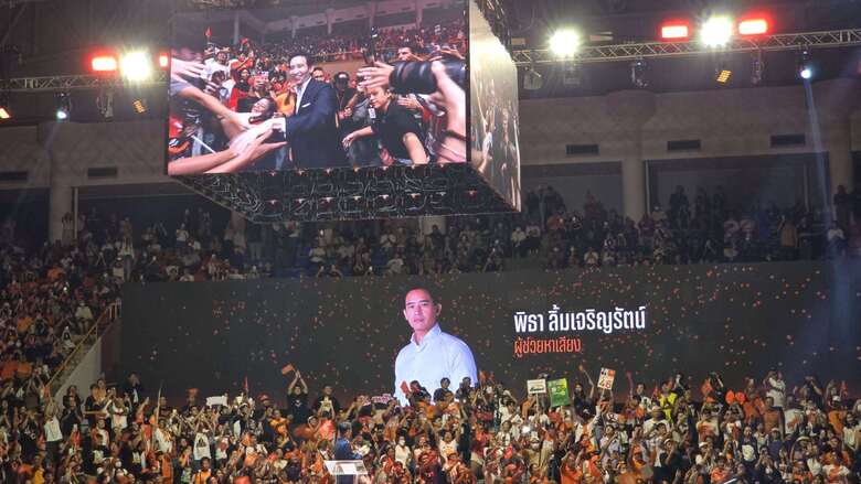 泰國2/8將舉行國會大選,6日晚間人民黨舉行選前造勢活動,當皮塔(Phitha Limcharoenrat)出場時,支持者情緒沸騰。(圖:洪耀南提供)