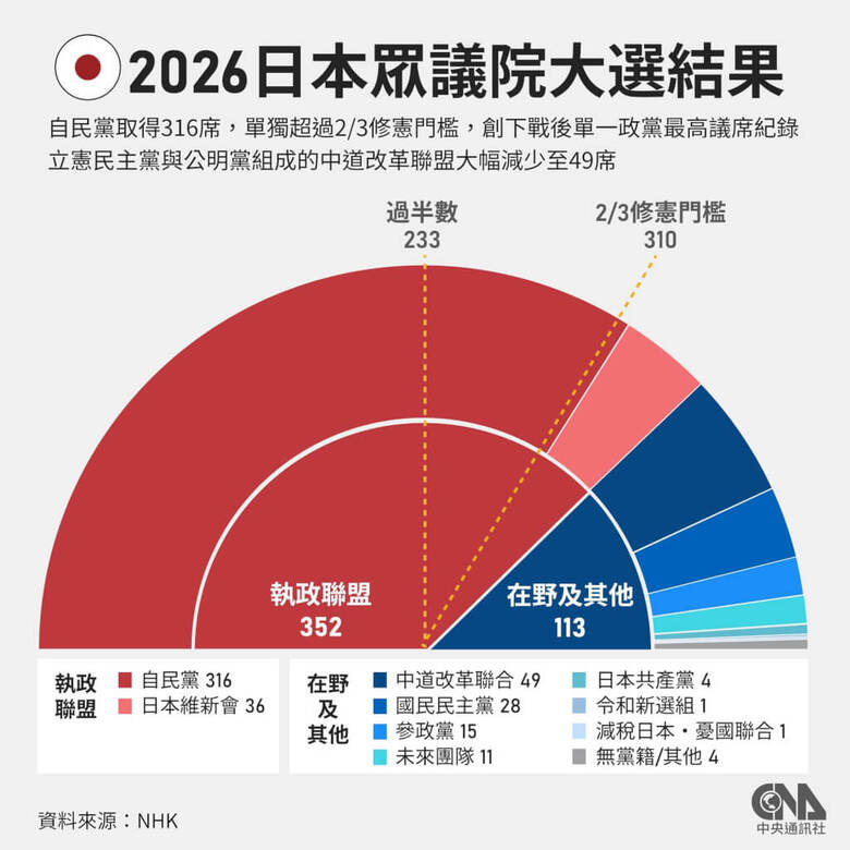 日本眾議院大選結果出爐。(中央社製圖)