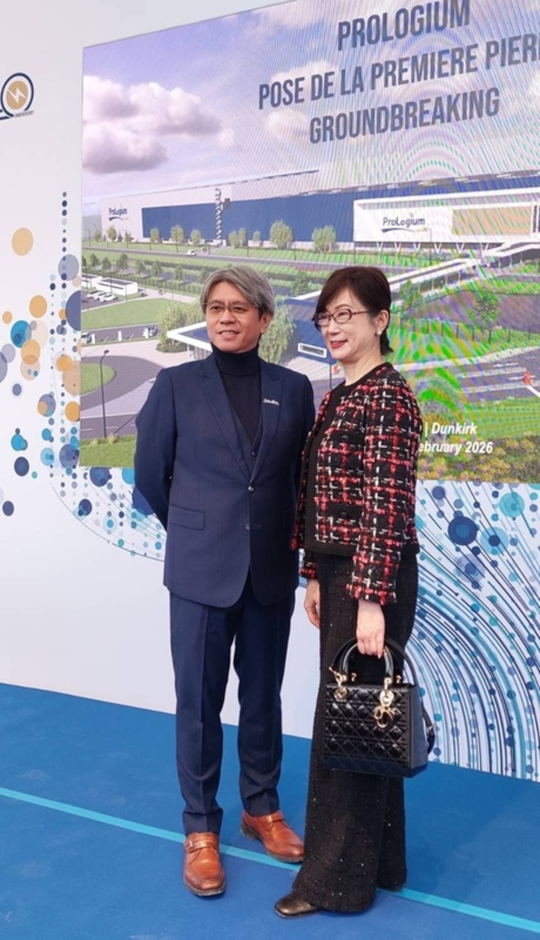 台灣輝能科技在法國投資超級工廠,10日舉行動土儀式,由創辦人兼執行長楊思枏(左)主持,駐法代表郝培芝(右)出席。(駐法代表處提供,中央社記者曾依璇敦克爾克傳真)