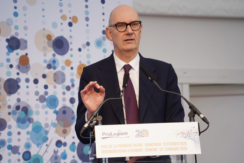 台灣輝能科技在法國投資超級工廠,10日舉行動土儀式。法國經濟部長勒斯鳩(Roland Lescure)親自參與,期許早日看到台灣設計、在地製造的電池量產。(中央社記者曾依璇敦克爾克攝)