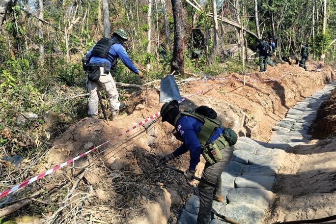 (台泰時報2月11日電)泰國武裝部隊司令部2月11日表示,國家地雷行動中心派遣第3人道排雷行動單位,前往素林府塔奎城堡周邊 Zone C 區域執行地雷與未爆彈搜索及排除任務,並支援第22步兵營行動。此次作業共使165平方公尺土地恢復安全,並發現多項爆裂物。