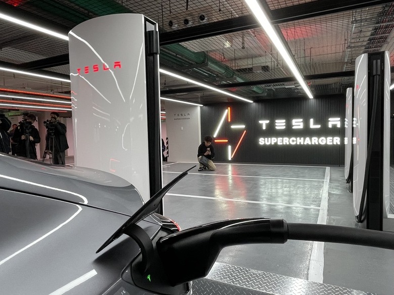 特斯拉11日在台北啟用全台最大V4第四代超級充電站「台北大巨蛋」。(中央社記者鍾榮峰攝)