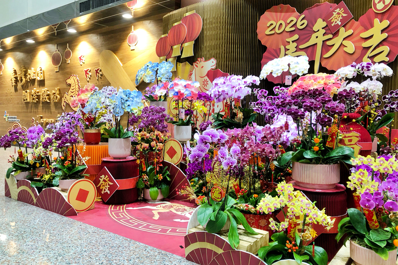 在航廈內的花台規劃,機場公司的植栽配置特別以繽紛多彩的麗格海棠為主,搭配紅柳、銀柳增添年節氛圍,而在航廈服務台、玻璃門及牆面等處也會張貼延伸主視覺設計,讓出發、抵達及短暫停留的旅客皆能感受濃厚年味與歡迎之意。