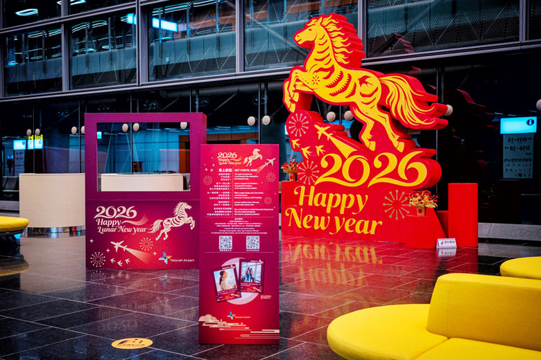 機場公司表示,配合今年生肖馬年,在主視覺設計上特別以「奔馳馬姿」圖騰,整體設計理念融合桃園國際機場特色與濃厚的春節意象,運用熱烈歡騰的色彩與吉祥元素,傳遞新年祝福、旅程順利與文化底蘊,展現喜慶與國際感兼具的年節主視覺。