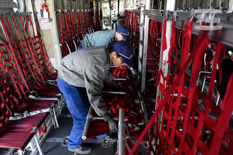 第十空運大隊101中隊機工長莊淵傑說,依據任務特性,機組人員會改裝、增設或調整貨艙座椅,不僅為了人員疏運,天候不穩時,更會加強裝備固定並時刻提醒乘客繫緊安全帶,確保飛行的安全與舒適。