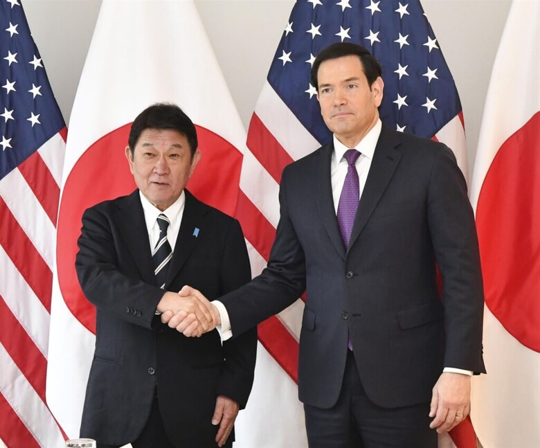 日本外務大臣茂木敏充(左)與美國國務卿盧比歐(右)14日在德國慕尼黑安全會議場邊進行會晤。(共同社)