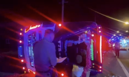 (台泰時報2月16日電)泰國南部董里府14日深夜發生雙層巴士翻覆事故。一輛行駛「普吉-勿洞」路線的2層冷氣巴士,於懷耀縣納翁鎮三馬奇學校對面路段失控衝入路旁水溝並側翻,造成超過30人受傷,其中10餘人重傷。事故發生後,救援人員破壞車尾玻璃將乘客救出,並在現場進行初步急救後送醫治療。