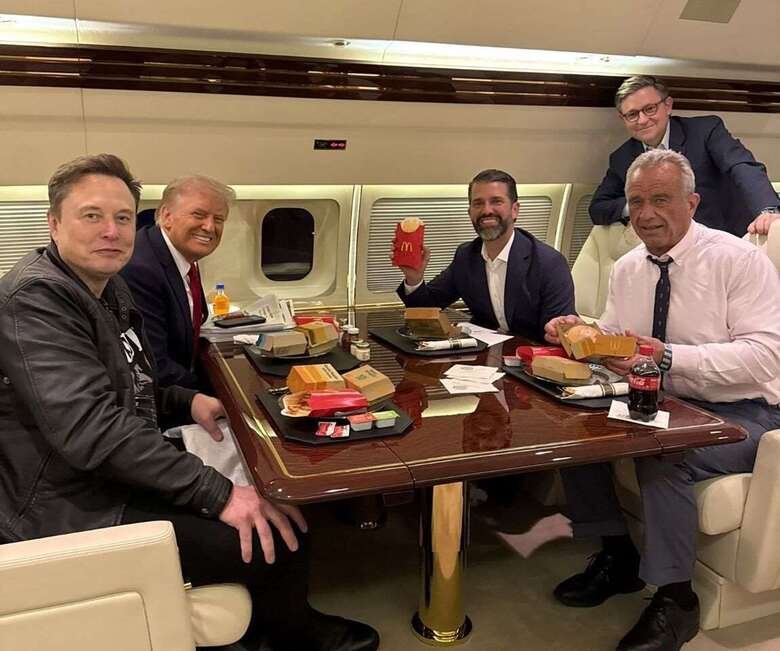 圖為川普和小羅勃.甘迺迪2024年11月間,搭機前往紐約觀賞終極格鬥冠軍賽時,共享麥當勞大餐。(圖:@DonaldJTrumpJr)