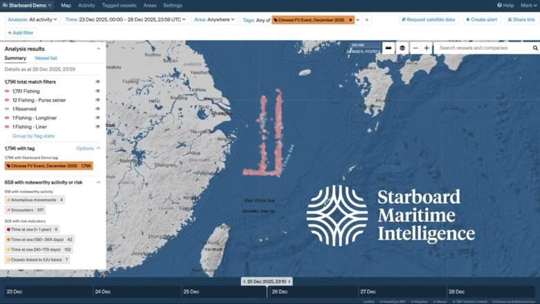 船隻定位資料顯示,中國漁船於去年耶誕節期間在東海大規模進行陣列式聚集。(圖取自x.com/StarboardIntel)
