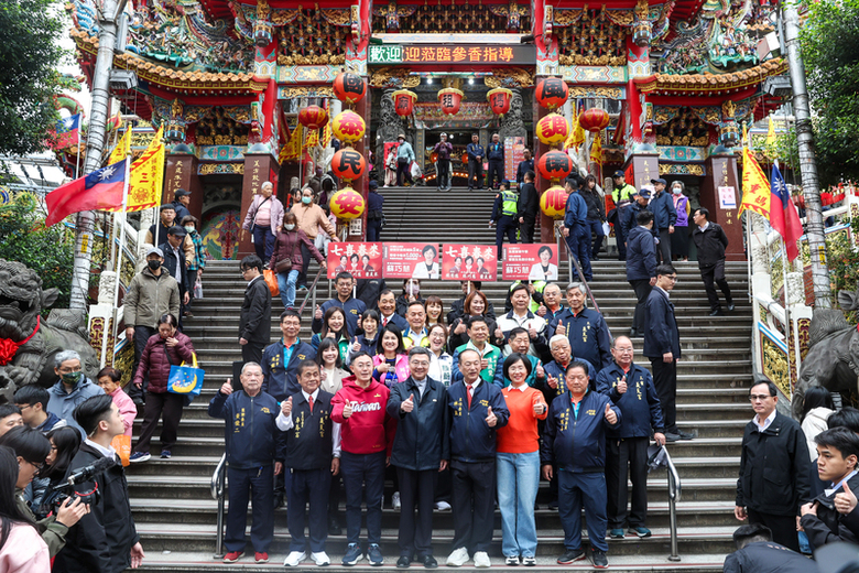 行政院長卓榮泰(前中)18日大年初二宮廟走春行程滿,下午到新北市三重區義天宮參拜祈福,並與眾人在廟宇大門外合影留念。(中央社記者吳家昇攝)