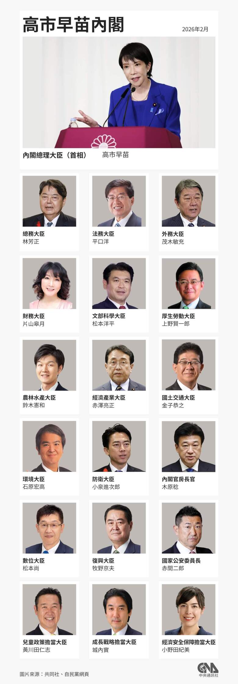 對於全體閣僚留任,高市早苗表示:「從今天起,高市內閣2.0正式啟動。每一位成員都是在各自政策領域站在第一線的人才,且已全速推動政策落實,因此我決定全員留任。」