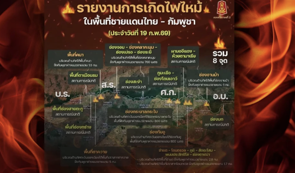 (台泰時報2月20日電)泰國第二軍區19日通報,泰柬邊境目前有8處區域列入野火監控範圍,火源與濃煙來自柬埔寨境內,暫未對泰國社區造成影響。軍方表示,已協同地方與邊境單位密切監測,防範火勢蔓延至泰國領土。