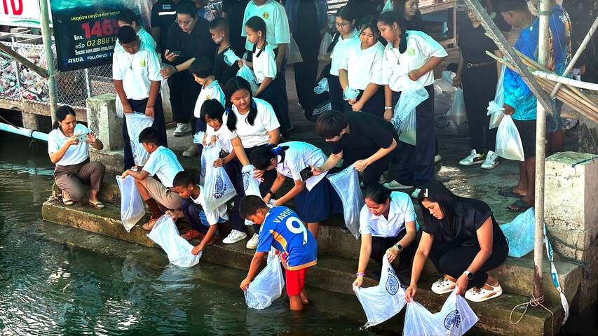 (台泰時報2月20日電)泰國夜功府直轄縣邦乍格倫鎮第 4 村多功能活動中心 20 日舉行放流活動,由第 4 村村長蘇帕(Supap Kongraksa)率領社區領袖與居民,將 1,000,000 尾斑節對蝦(Banana Shrimp)蝦苗投入自然水域,期盼提升沿海水產資源豐度,並為社區建立長期經濟基礎。