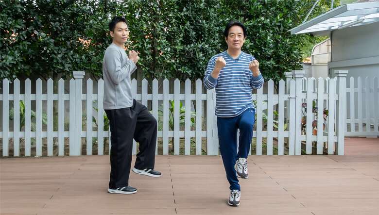 總統賴清德(右)與李洋(左)合體推廣居家健康操。(總統府提供)