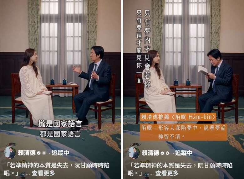 總統賴清德(右)21日透過臉書分享一段朗讀台語詩的影片,影片中他邀請台語詩集「日花閃爍」作者温若喬(左)一同朗讀。(圖取自facebook.com/chingte)