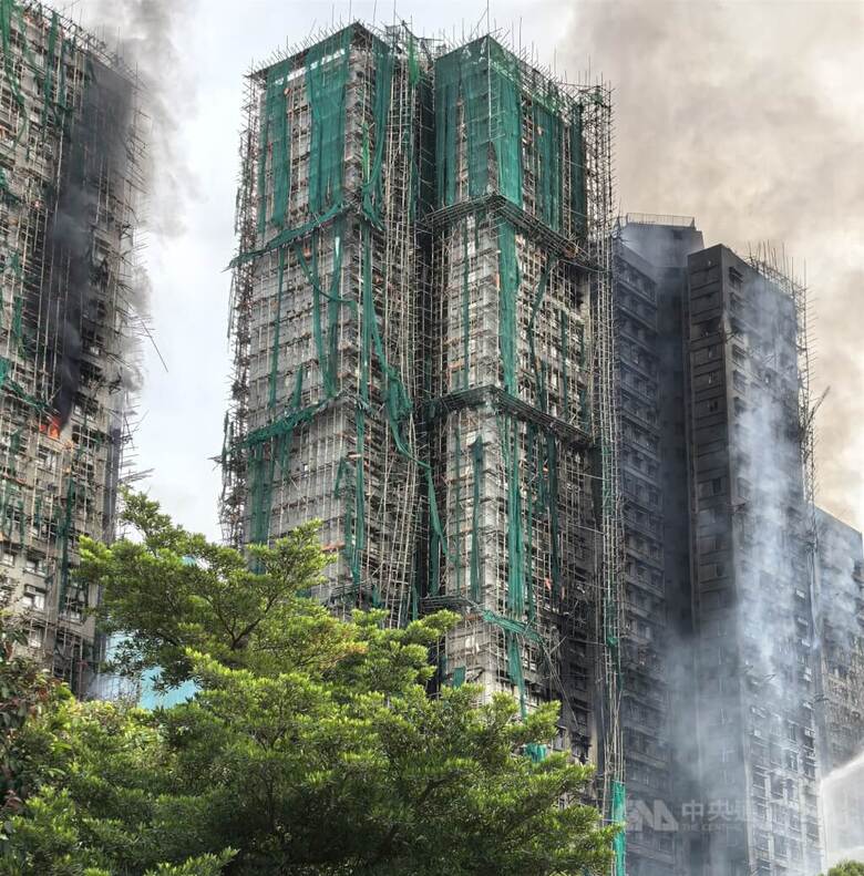 去年11月26日宏福苑發生大火,持續43小時,多座大廈嚴重焚毀。(中央社檔案照片)