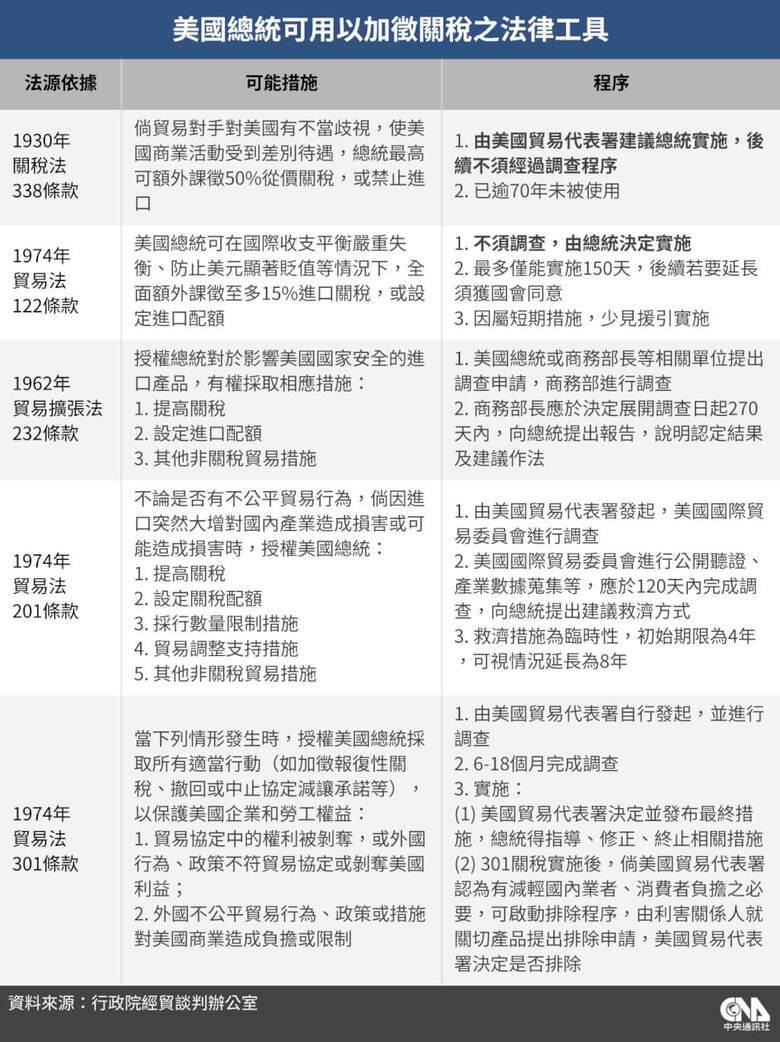 連賢明說明,美方這次改採的「122條款」在歷史上幾乎未被動用,其原始立法目的是因應國際收支出現重大失衡或外匯存底不足等極端情況,允許總統以臨時性提高關稅方式抑制進口、緩解外匯壓力,因此條文設有「非歧視」原則,理論上不得針對個別國家課徵差別稅率。