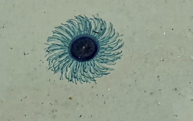 公園管理單位表示,藍鈕水母主要出現在島嶼東側、當地俗稱「前灘」的游泳區域,數量較為集中。這類海洋生物體型約2至3公分,外觀呈鮮明藍色,中央有圓形鈕扣狀盤體,周圍分布多條觸手,常隨洋流漂流,並可能被海浪帶上海岸。