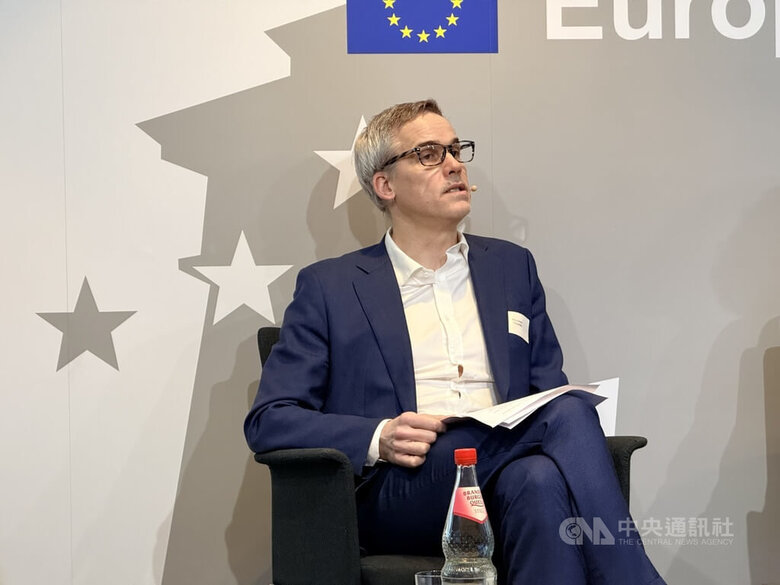 台灣女婿施益堅長年居住台灣,對台灣第一手觀察成為當前德國了解台灣社會的重要窗口之ㄧ。圖為施益堅在柏林歐盟中心的一場演說活動。(中央社記者林尚縈柏林攝)