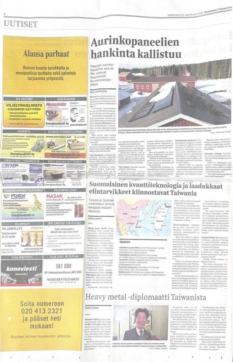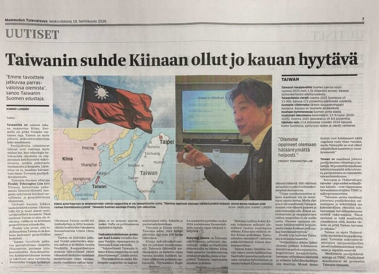 芬蘭3大報之一「農村未來報」(Maaseudun Tulevaisuus)23日刊登駐芬蘭代表林昶佐專訪內容,談及台芬經貿和民主韌性。(駐芬蘭代表處提供,中央社記者巫祈麟赫爾辛基傳真)