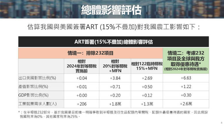 鄭麗君強調,122條款對台灣爭取到攸關半導體關稅的232優惠待遇不會有影響,ART爭取到15%關稅不疊加是相對好的待遇,但美方以122條款將全球關稅追加至15%且要疊加MFN稅率,雖然比去年8月起適用的20%疊加MFN來得好,但對台灣的衝擊仍比2024年實施對等關稅前來得高,將導致台灣出口金額、產值、GDP、工業就業人數呈現負成長。