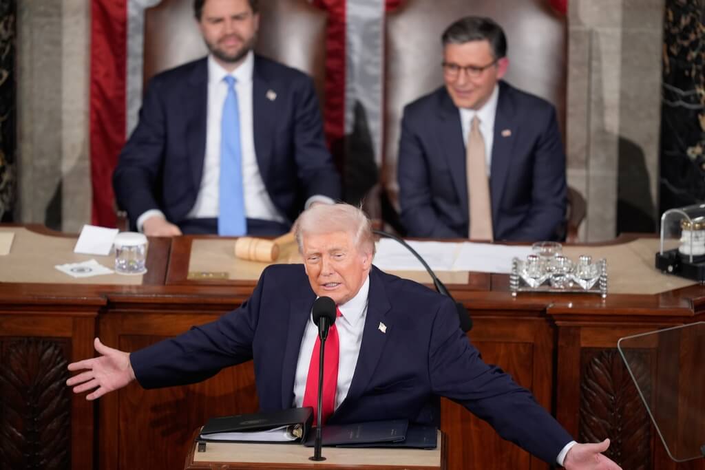 美國總統川普(前)24日在國會發表國情咨文演說。(美聯社)