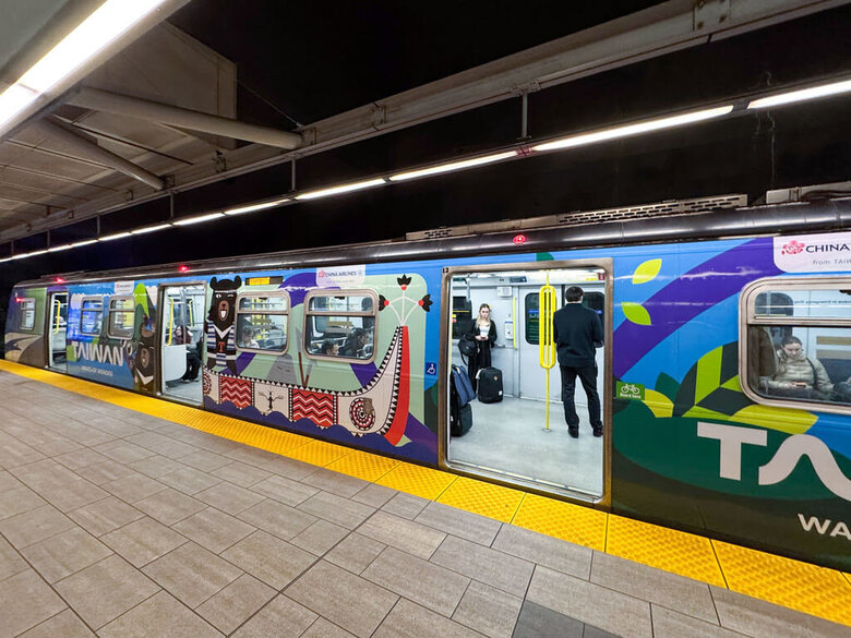 溫哥華最繁忙的捷運線-加拿大線(Canada Line)的列車外觀呈現台灣青山綠水的亮麗顏色,還有標誌性的台灣黑熊、蘭嶼獨木舟等繽紛插畫,印襯著大大的TAIWAN、「台灣」字樣,讓人很難不注意到這輛美麗的彩繪列車。車廂內還有大型直式與橫式廣告版位,各主要車站內的數位廣告螢幕也播放著台灣觀光的亮點。