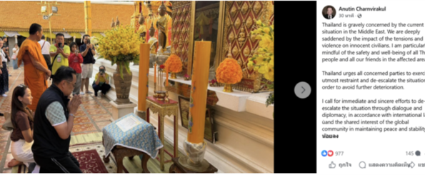 阿努廷在貼文中指出,泰國對當前中東地區發展深表關注,並對衝突對平民造成的影響表示關切。他強調,泰國政府尤其重視當地泰國公民及所有受影響人員的安全與福祉。