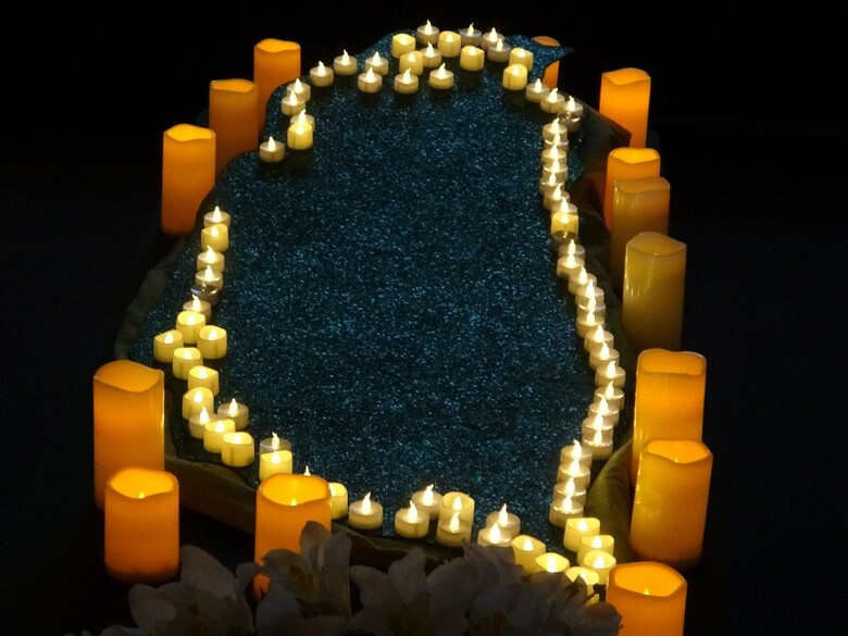 洛杉磯台灣會館舉行二二八追思會,用燭光擺滿台灣地圖,象徵對受難者的追思。(中央社記者林宏翰洛杉磯攝)