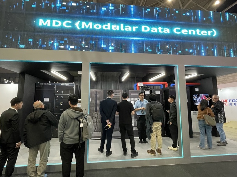 輝達(NVIDIA)將於美國時間16日至19日舉行GTC技術大會,市場矚目輝達與鴻海打造的先進人工智慧(AI)超級電腦Vera Rubin整機櫃方案。圖為2025年11月鴻海科技日展示的模組化資料中心。(中央社記者鍾榮峰攝)