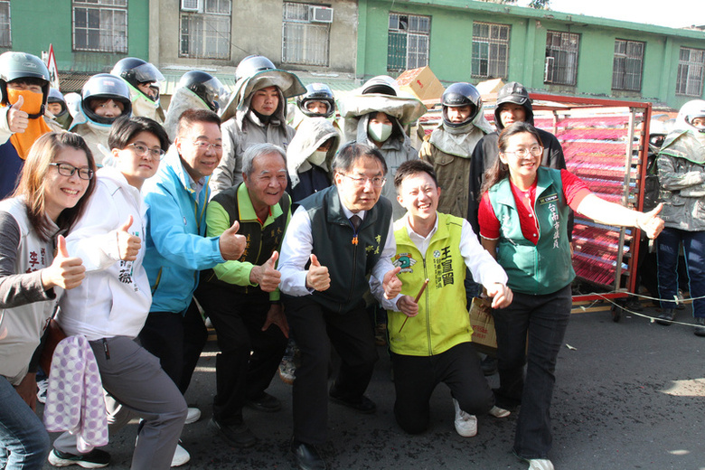 台南鹽水蜂炮活動2日上午展開2天2夜平安遶境行程,台南市長黃偉哲(前右3)主持啟炮後參觀首座施放炮城。(中央社記者楊思瑞攝)
