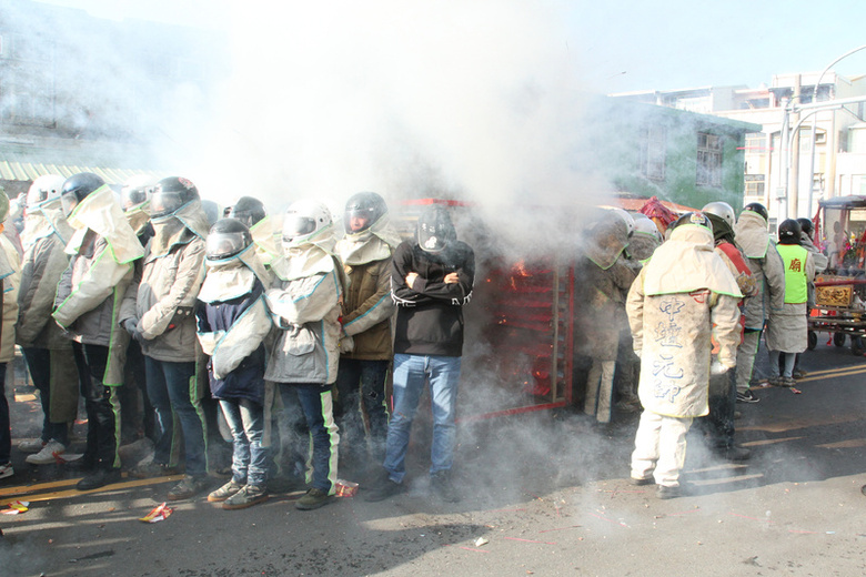 神轎隊伍從武廟出發後,在距離不遠處路口就有民眾將炮城推到路上,在神轎隊伍抵達時引燃施放,吸引不少喜愛體驗蜂炮炸射快感的民眾聚集體驗,炮城主人則希望藉蜂炮「愈放愈發」,運勢順利。