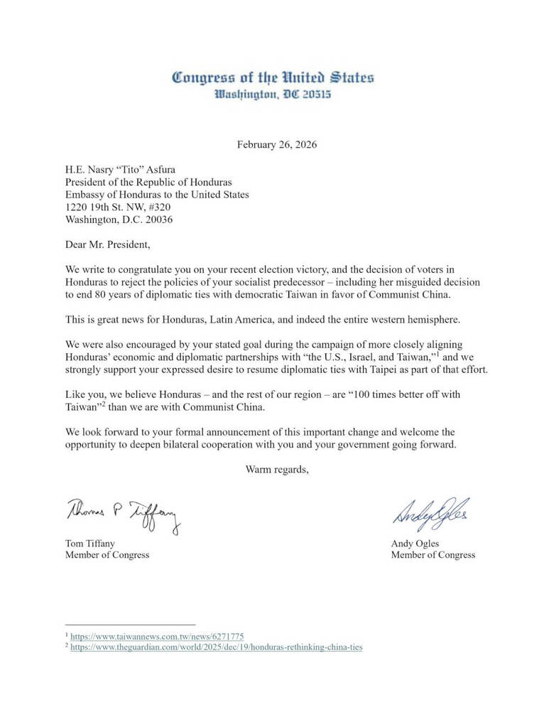 共和黨聯邦眾議員蒂芬尼(Tom Tiffany)與奧格茲(Andy Ogles)2月底致函今年1月甫就任總統的阿斯夫拉(Nasry Asfura),除了恭賀贏得大選外,也提到宏國選民透過選票拒絕前總統的相關政策。