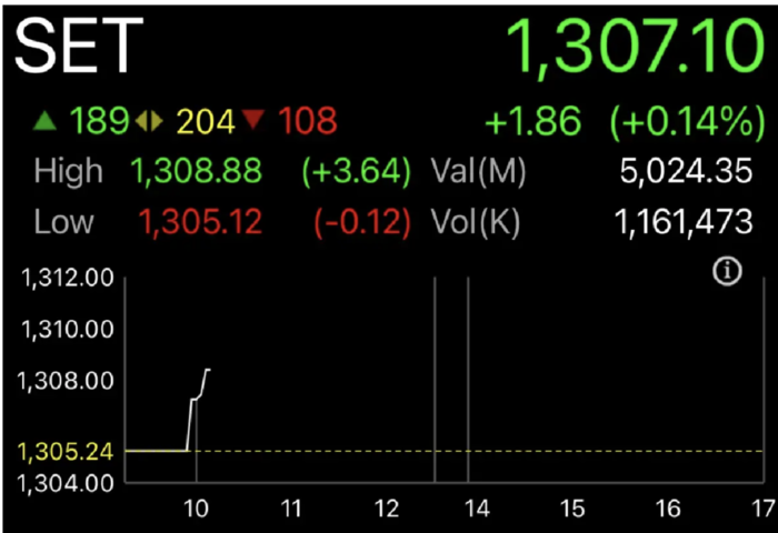 (台泰時報10月8日電)曼谷證券交易所(SET)8日上午開盤上漲1.86點,報1307.10點,漲幅約0.14%,顯示市場情緒審慎。投資人正聚焦泰國央行(泰國央行,BOT)貨幣政策委員會召開的首次會議,預期將決議是否調降政策利率0.25個百分點至1.25%,以因應經濟放緩壓力。