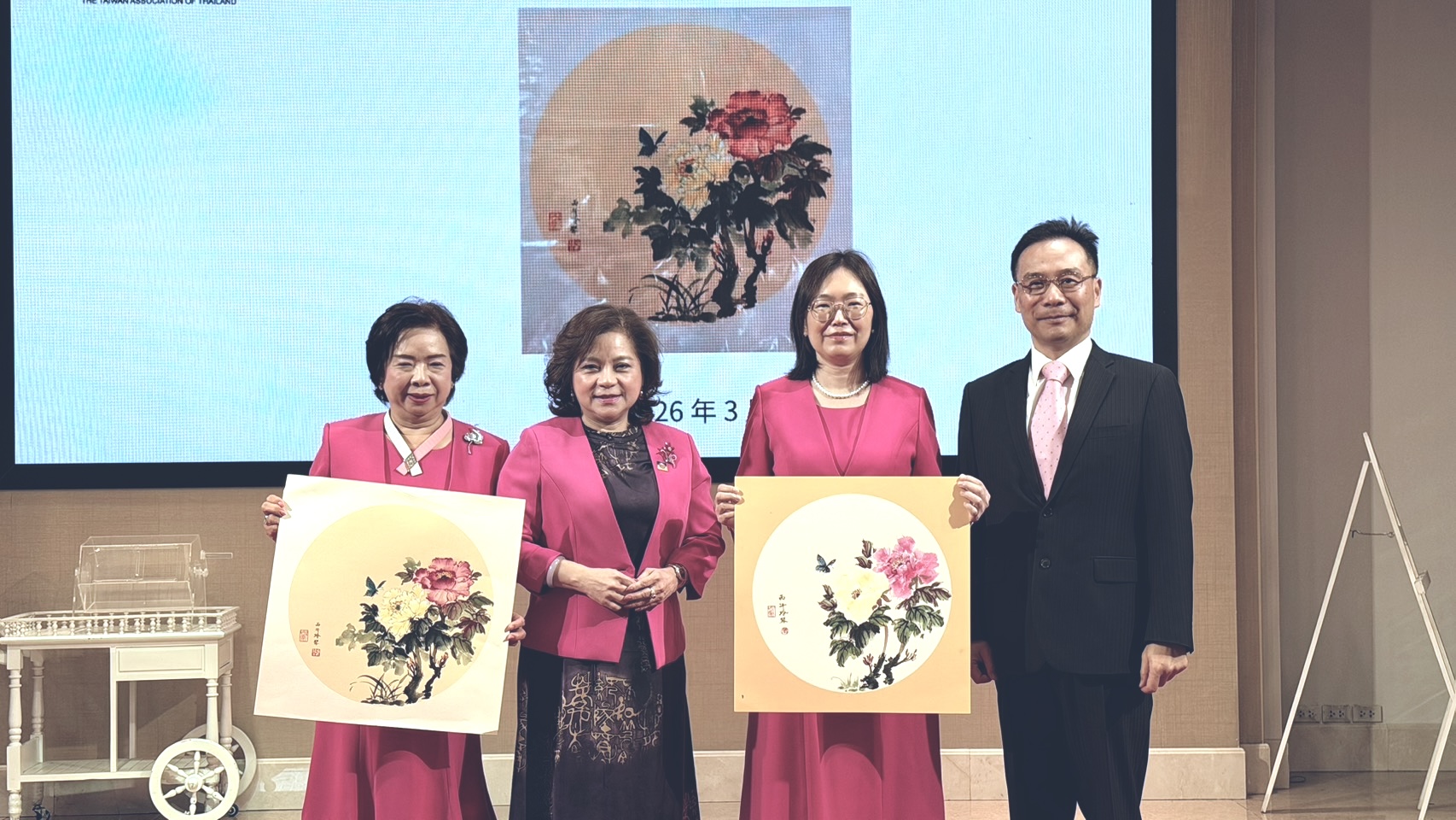 活動另一亮點為台灣會館主席張玲琴現場揮毫作畫,以牡丹為題創作書畫作品。她表示,三八婦女節象徵女性地位與力量的提升,希望透過藝術形式與大家分享文化之美。