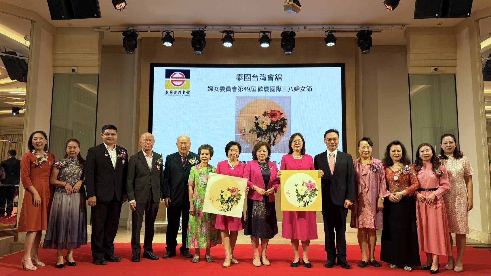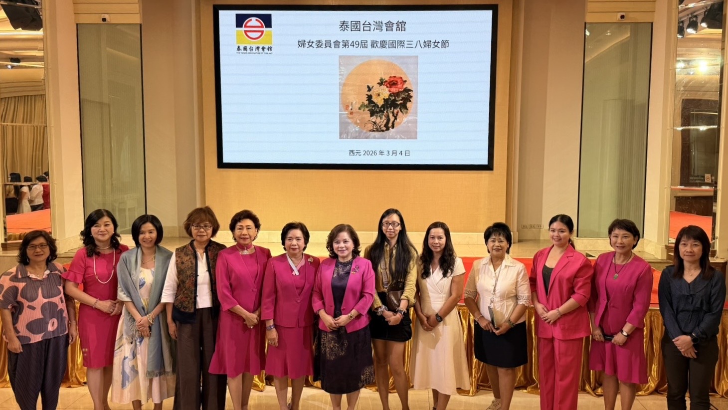 (台泰時報曼谷電)為慶祝國際婦女節,泰國台灣會館婦女委員會於今(4)日上午在曼谷竹林餐廳舉辦「第49屆婦女委員會慶祝三八婦女節聯誼活動」。台灣會館由主席張玲琴偕永遠名譽主席蘇林妙芬、林何佩娟,主任委員林信慧與永遠名譽主任委員陳李淑雲、呂蔡淑清,副主任委員黃車銀鳳等婦女委員會等重要幹部出席,同時邀請台灣駐泰代表處藍夏禮大使與大使夫人陳柏惠女士蒞臨指導。
