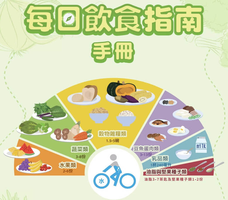 這次新版每天飲食指南手冊,更加著重在蔬菜與水果的攝取量,從過去舊版建議每天攝取蔬菜類3至5份,增加至3至8份,蔬菜類1份相當於煮熟後直徑15公分盤1碟,或約大半碗;水果類從過去的2至4份,提高到2至6份。