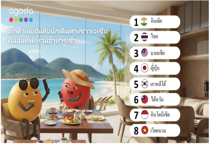 (台泰時報10月8日電)亞洲旅遊市場出現新趨勢,根據線上旅遊平台Agoda統計,越來越多旅客偏好選擇「含早餐」的住宿方案,其中泰國旅客使用此篩選條件的比例高達13%,位居亞洲第二,僅次於印度的14%。此現象顯示亞洲旅遊者對便利與性價比的重視,並反映早餐體驗已成為旅遊住宿的重要一環。