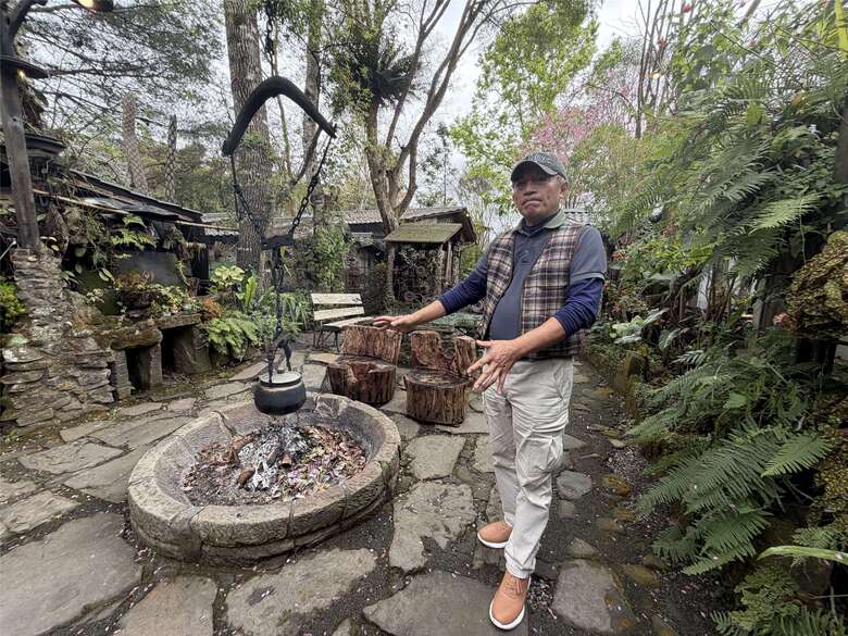 他說:「我老家就是長這個樣子,大概我打造成8成像了。我老家是沒有那麼大,但是我老家是一個聚落,20幾戶大概每一棟房子距離一、兩百米,喔啊那個在森林裡面啊炊煙裊裊。我這個是縮小版,沒辦法,我這邊的空間不大,我必須要這麼做啊!」