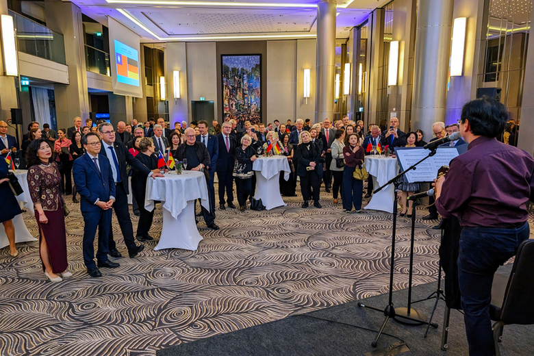 駐德代表處在柏林舉辦國慶酒會,德國聯邦教育部政務次長布蘭德、前數位及交通部次長克魯克特及多位國會議員與政要出席。台灣音樂家現場演奏「燒肉粽」等台語歌曲,為活動增添溫暖氛圍。(駐德代表處提供,中央社記者林尚縈柏林傳真)